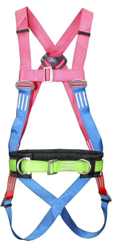 Регулировка размера привязи осуществляется при помощи 6 пряжек: две расположены на ножных лямках, две расположены на плечевых лямках, одна на поясе и одна на груди. Страховочная точка крепления расположена на спине, которую так же можно регулировать на Х-образных плечевых лямках для правильного положения под рост работника.
